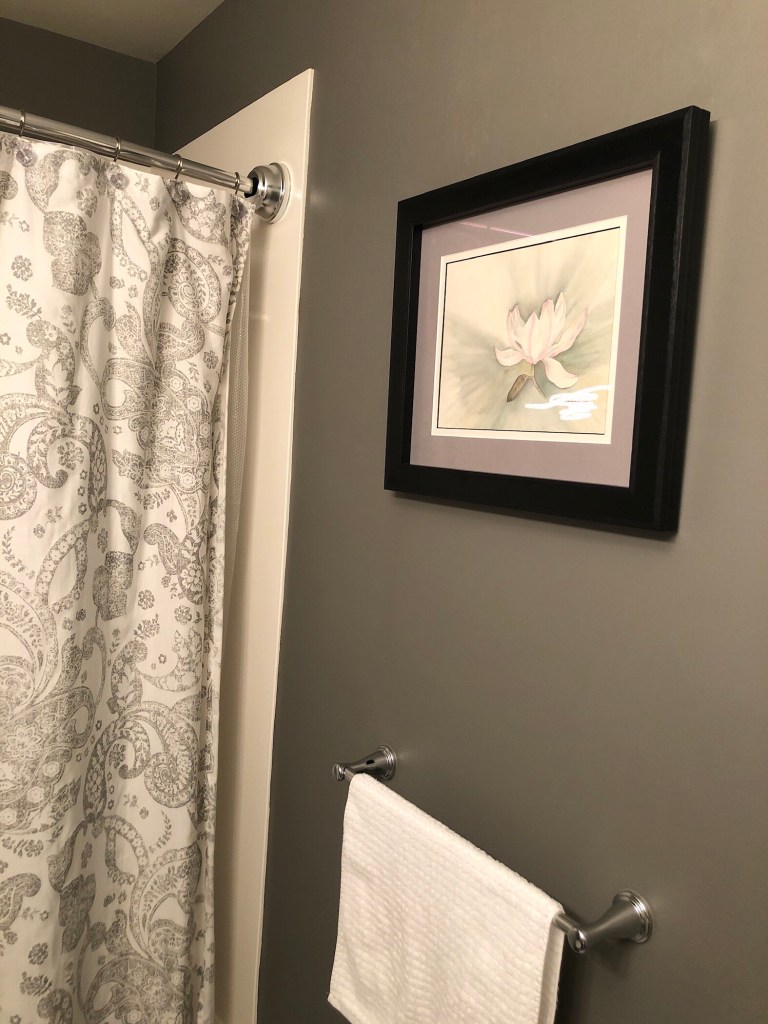 At the end of the night, Linda approached me with a gift. She had one of Lori’s paintings that she had never framed/hung and wanted me to have it. It’s a magnolia flower- my favorite tree. I just love it, and love that she thought to give it to me. I just had it framed and hung it in our hall bathroom. I’d been looking and looking for something for that wall, and just couldn’t find anything I liked. This is perfect.