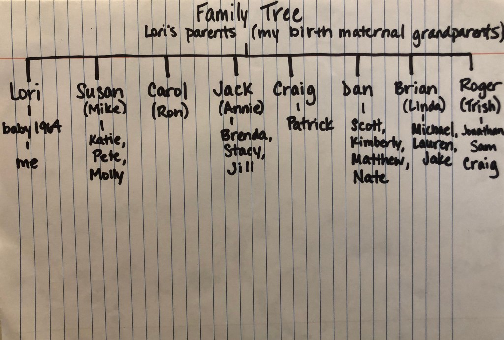 My husband and daughter and I were heading out to get some dinner after the phone call. I was caught off guard by how sad I felt. It was very similar to how I had felt about Lori…I was feeling a loss of someone I had never met. A loss of a relationship that could have been, but never was. Also, I’m seeing Brian in a different way now. I’m reminded that people are not defined by one choice, one decision, one action or inaction. This may sound strange, but I have forgiven him for the hurtful results of his decisions in 1972. I know that they weren’t made alone, but Lori certainly had to carry the weight, and she carried it the rest of her life. But I forgive Brian now, and that feels good. I hope their souls are both at peace. Because I look up from my laptop, and my three awesome kids are talking in my kitchen, and that decision in late 1972 doesn’t seem like a mistake at all.